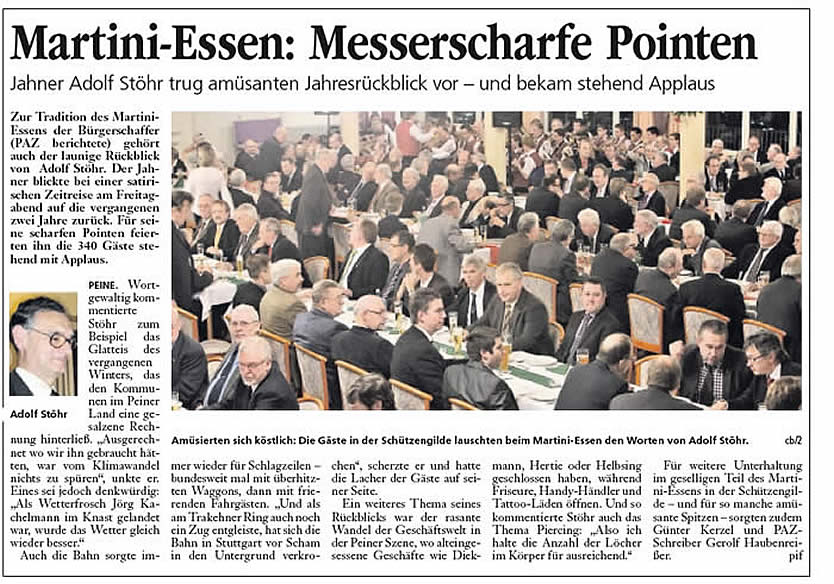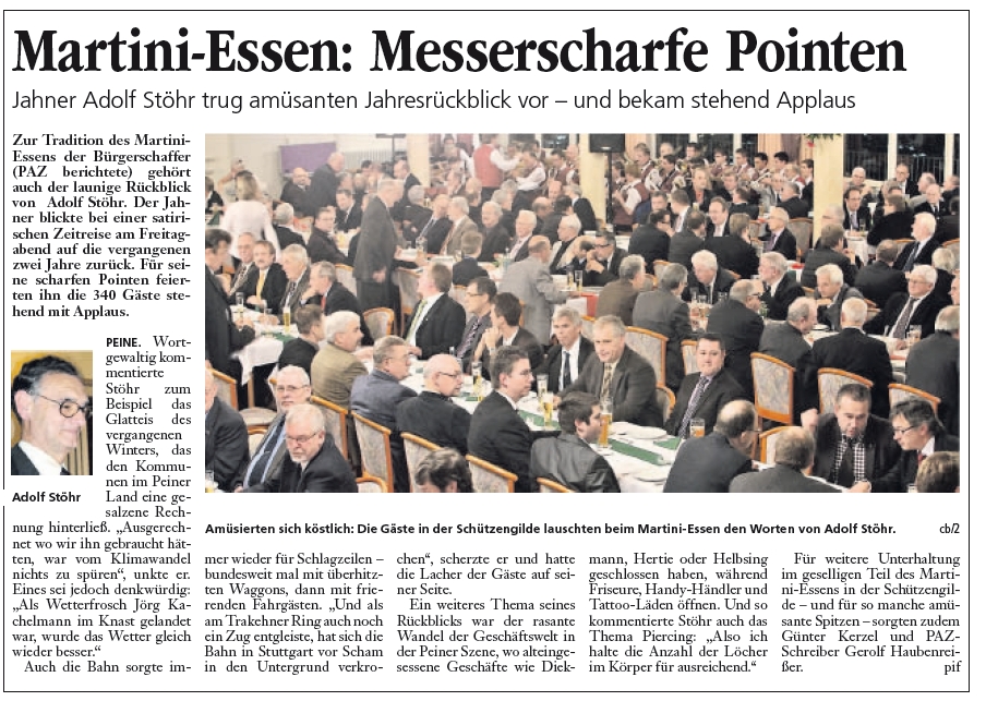 Adolf Stöhr versteht es, politische, wirtschaftliche und gesellschaftliche Ereignisse der Stadt aufs Korn zu nehmen. Mit donnerndem Applaus erhoben sich beim Martiniessen 340 Gäste von den Stühlen, als er seine Rede beendet hatte.