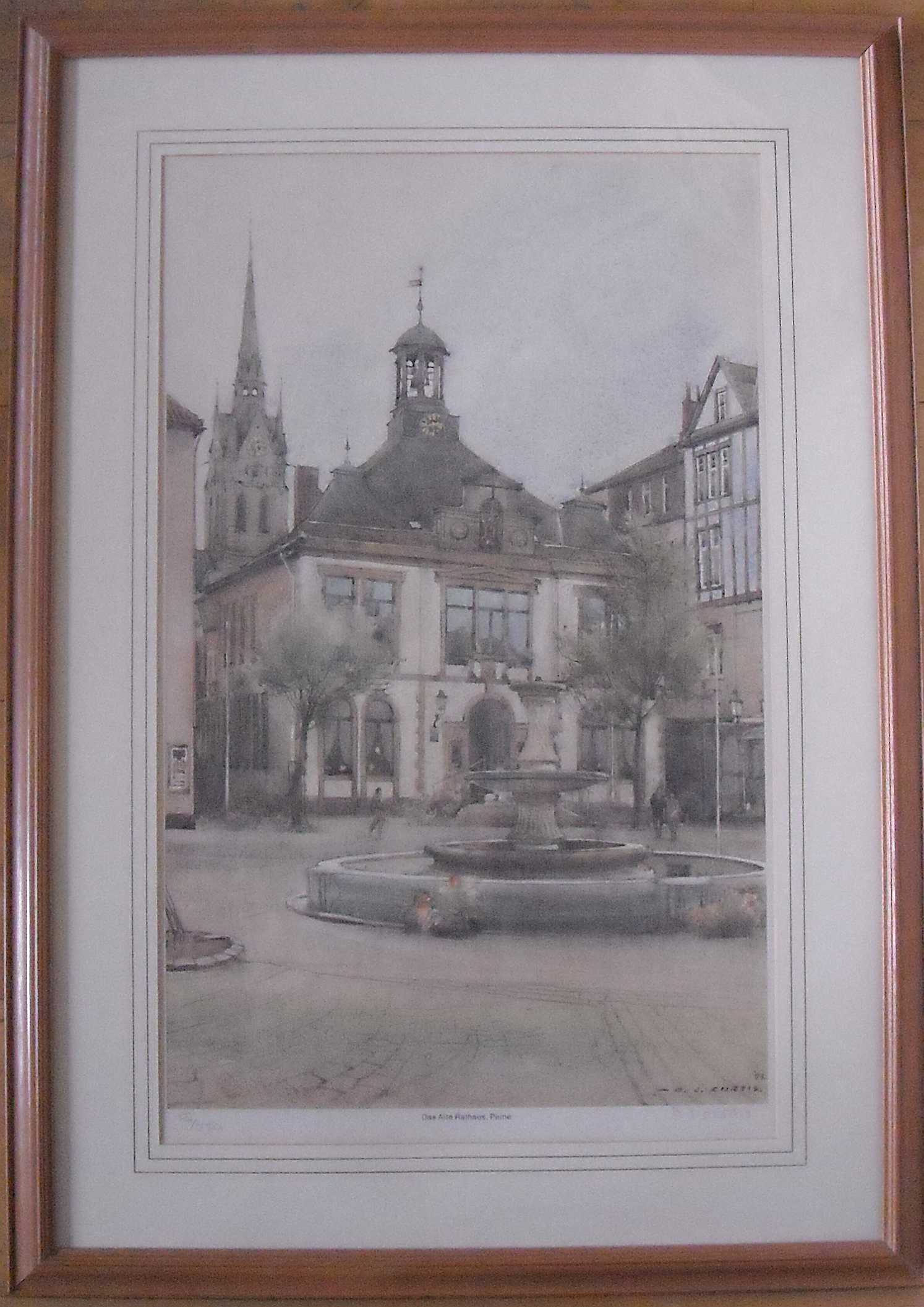 Das Bild zeigt das historische Alte Rathaus in Peine. Es ist in einem Buchenrahmen und hat die Maße 60 x 87 cm.